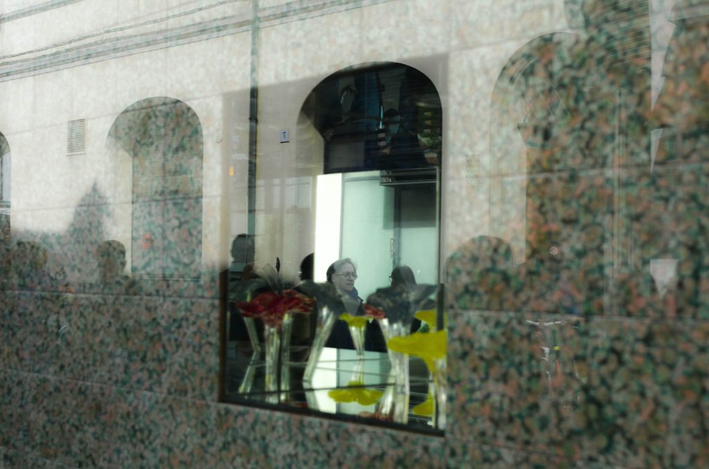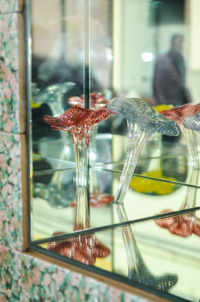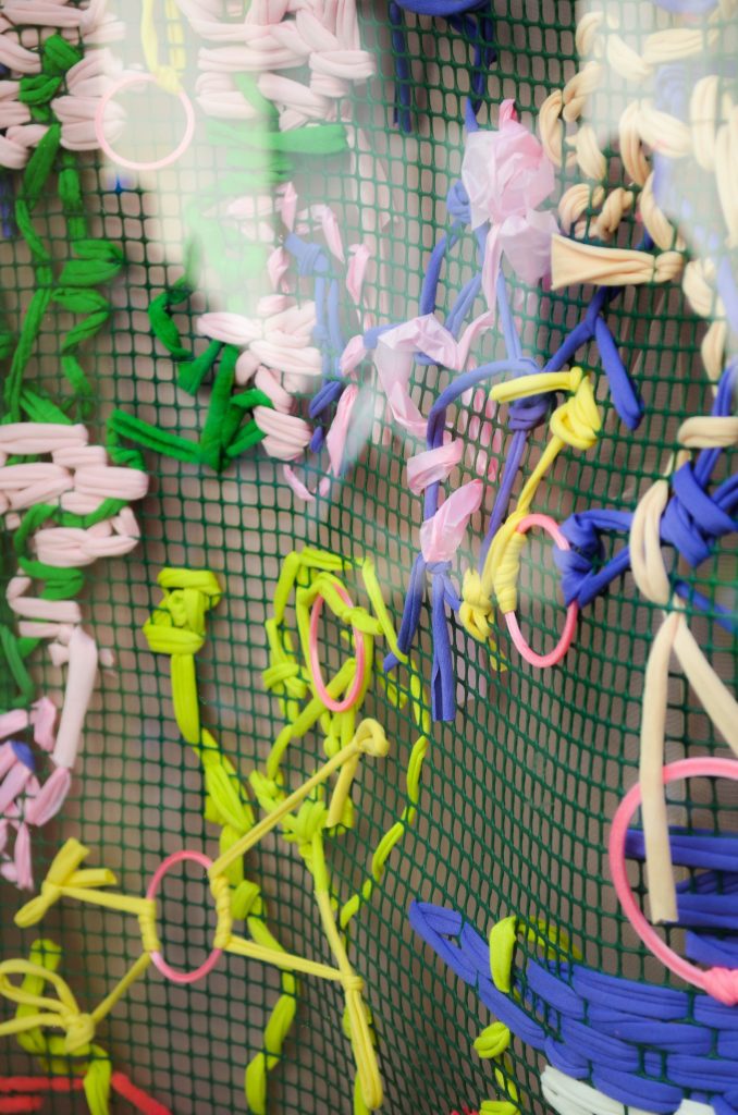Si tratta di un inno alla primavera e alla poesia attraverso molteplici estetiche. Aderente al vetro un pannello rivestito di piastrelle che ricorda un prato fiorito e, al centro del pannello, una nicchia fatta di specchi che ospita tre fiori in vetro realizzati dall’artista Lucie Claudia Podraska. Sull’ingresso della vetrina un’opera site specific realizzata da me anch’essa a tema primaverile: si tratta di un arazzo su rete con fili di stoffa colorati e materiali di riciclo.