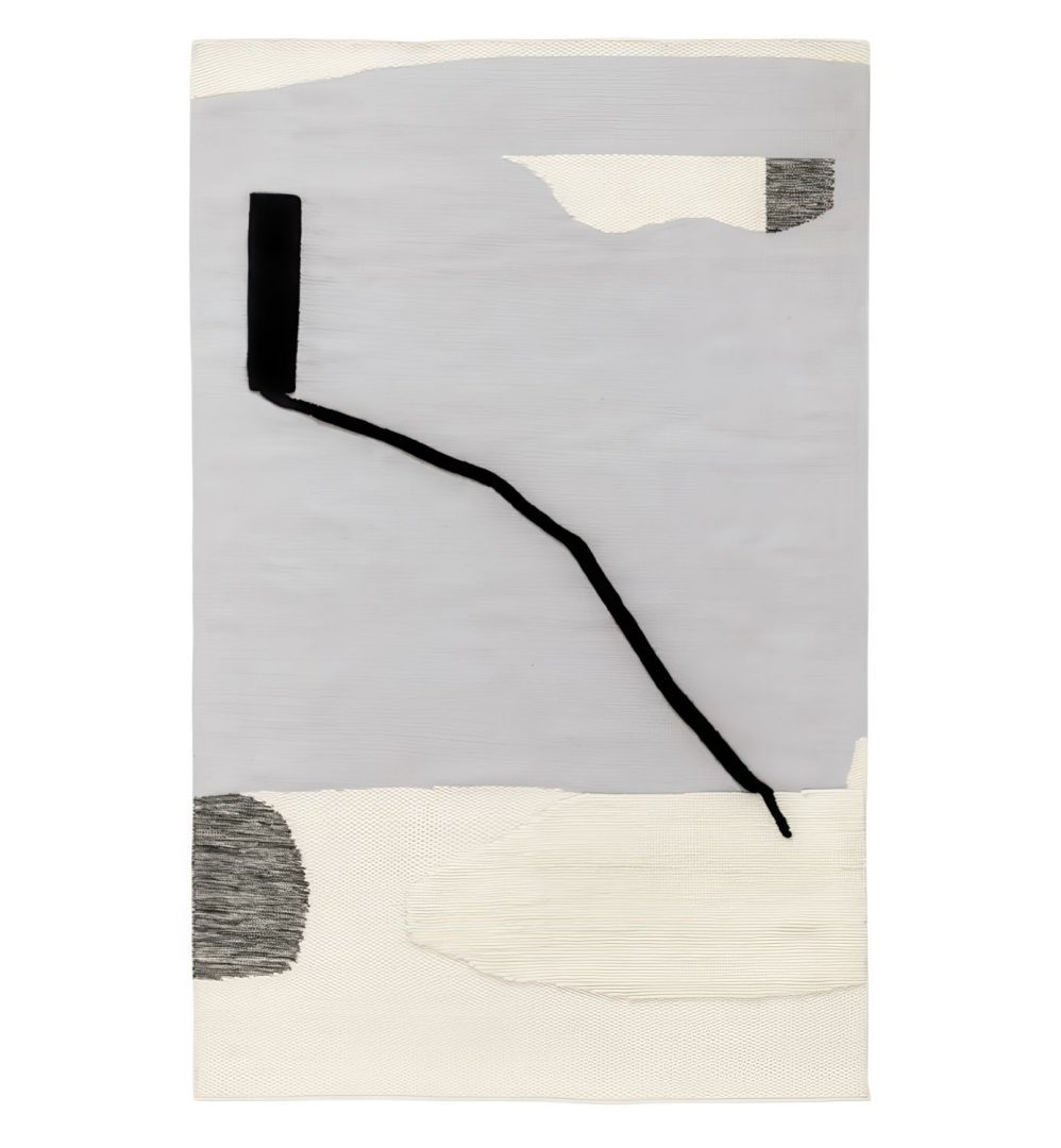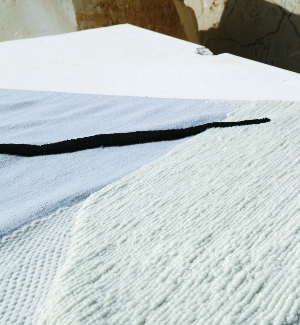 Blanco è un tappeto che riprende una superficie carsica, un paesaggio lunare percorso da un segno secco, nero, minimo. Il suo spazio primitivo accoglie forme aggettanti e materiche di ghiaccio, gesso, cemento.