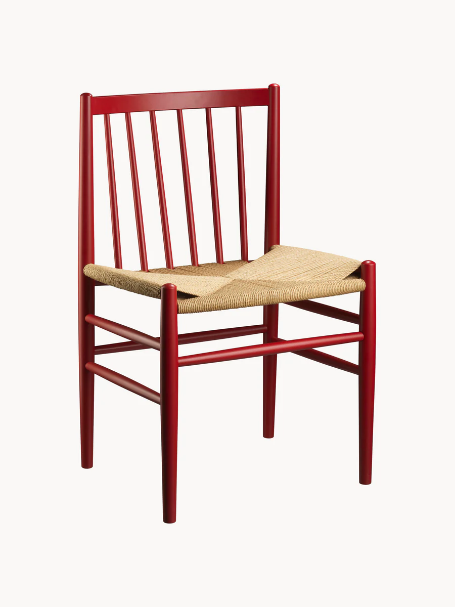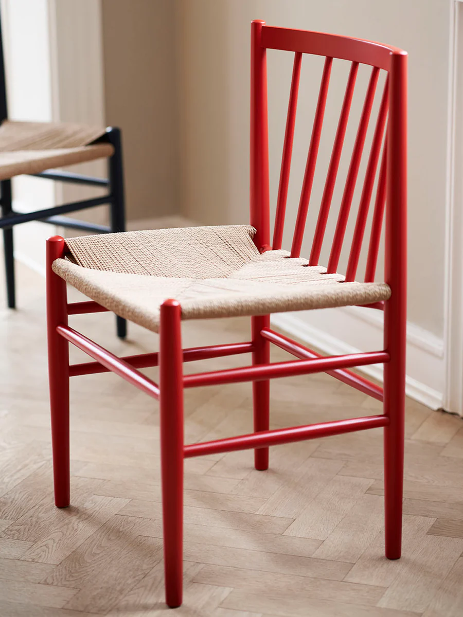 Disegnata negli anni ‘50 da Jørgen Bækmark la J80 è un’affascinante sedia in legno con schienale a raggiera e seduta in filato di carta.