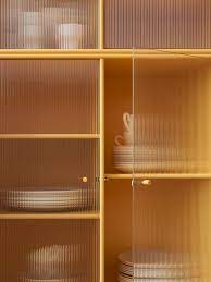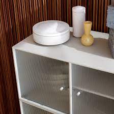 RIPPLE III è una vetrina di medie dimensioni con quattro ante in vetro ondulato. È disponibile con gambe, zoccolo oppure barra di sospensione per il montaggio a parete.