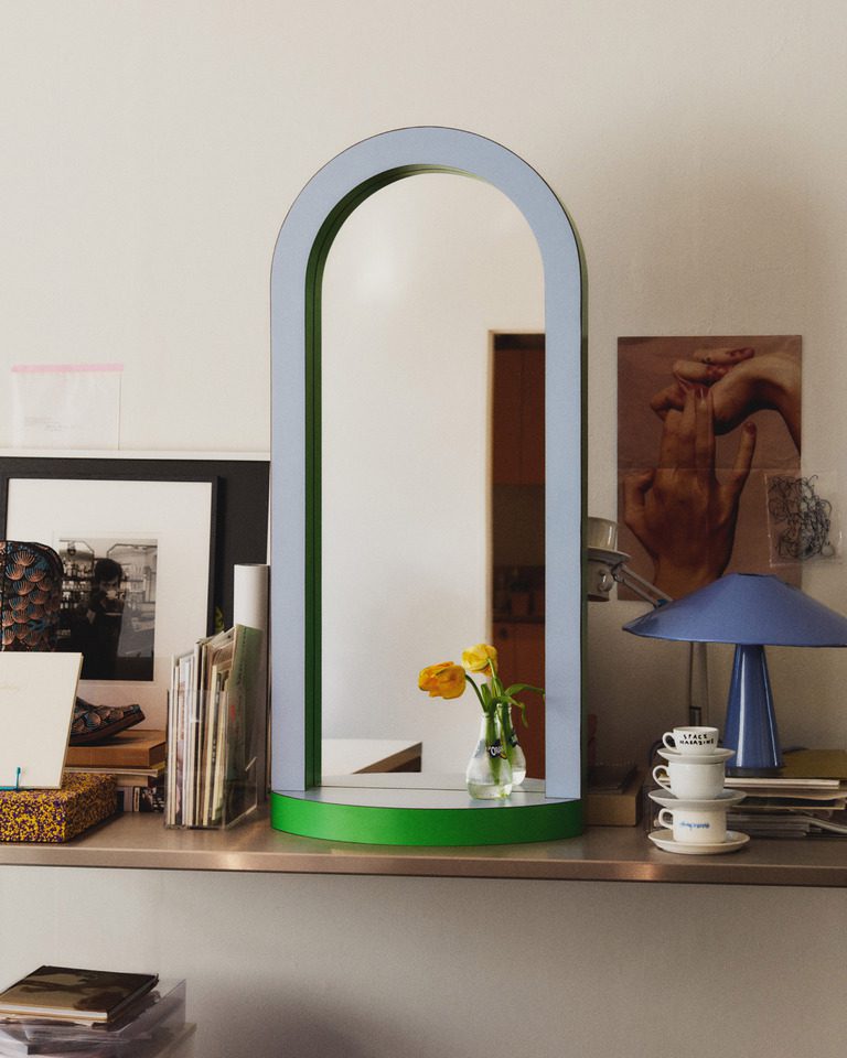 Questo specchio si ispira alla tradizionali finestre ad arco mediterranee, reinterpretato in modo giocoso pieno di colori. Una piccola mensola alla base può essere utile per mettere in mostra piccoli oggetti.