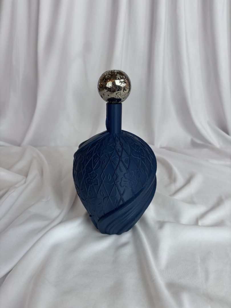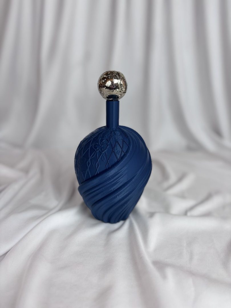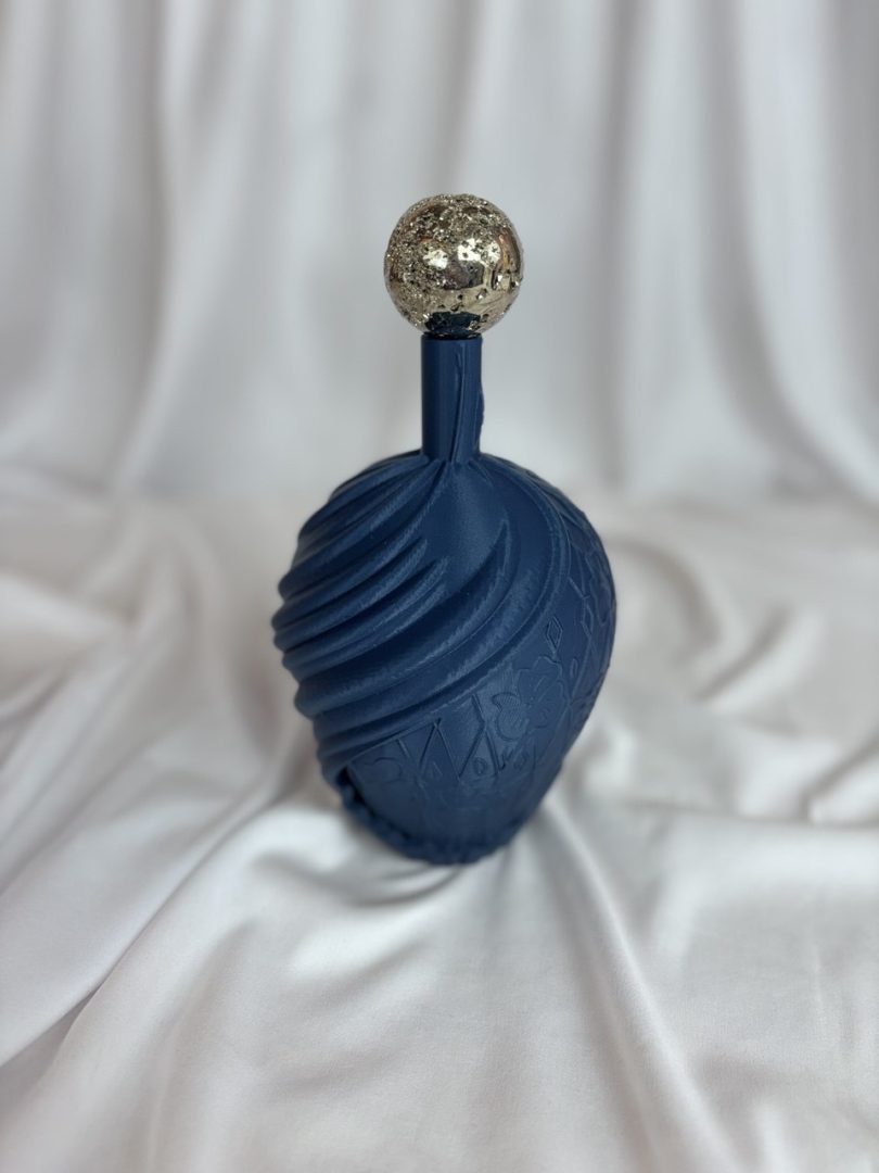 A un primo sguardo, complice il tappo-gioiello che lo completa, sembra un’ampolla porta essenze. Poi, guardandolo meglio, si coglie la somiglianza con il corpo della donna: sinuoso, drappeggiato e profumato. La veste non lo avvolge completamente, lascia scoperte parti coperte di piccoli fiori. La tenerezza  richiamata dal decoro floreale si unisce al coraggio e all’energia emanate dalla pirite del tappo.